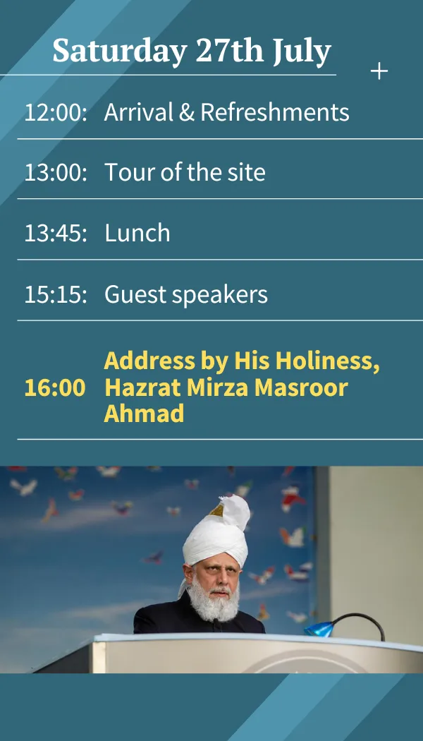 A special feature of this convention is that it is blessed by the presence of the Caliph, His Holiness Hazrat Mirza Masroor Ahmad, the head of the worldwide Ahmadiyya Muslim Community. He addresses the convention over each of the three days providing an invaluable insight into religious teachings and how they are a source of guidance for the world today